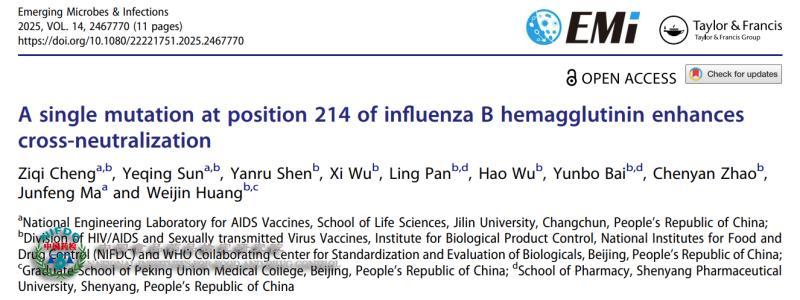 同刊发表的另一篇研究论文“A Single Mutation at Position 214 of Influenza B Hemagglutinin Enhances Cross-Neutralization”,进一步展示了假病毒技术在流感疫苗研发评价中的应用。研究者通过B型流感血凝素(HA)假病毒构建与中和实验,发现HA第214位点的一处单点突变即可显著增强不同B型流感毒株之间的交叉保护效果。这一发现不仅揭示了分子水平的关键抗原位点,也为广谱流感疫苗的设计和评价提供了重要参考。