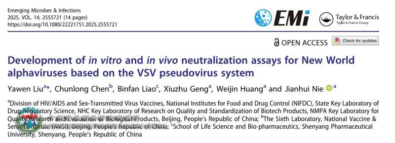 2024年美国多地出现马脑炎疫情,引起全球恐慌。为做好相关防控产品的研发评价工作,中检院开展了马脑炎假病毒研究工作,在《EMI》期刊发表题为“Development of In Vitro and In Vivo Neutralization Assays for New World Alphaviruses Based on the VSV Pseudovirus System”的研究论文。研究团队基于VSV系统构建了新世界甲病毒(包括东方马脑炎EEEV、西方马脑炎WEEV和委内瑞拉马脑炎VEEV)的假病毒,并建立细胞和小鼠假病毒感染模型,可以系统评估病毒感染特征与抗体中和活性。这一研究突破了三级生物安全实验室条件下操作高致病性病毒株的限制,使相关候选疫苗和抗病毒药物的筛选评价能够在更高效的二级生物安全实验室条件下开展。